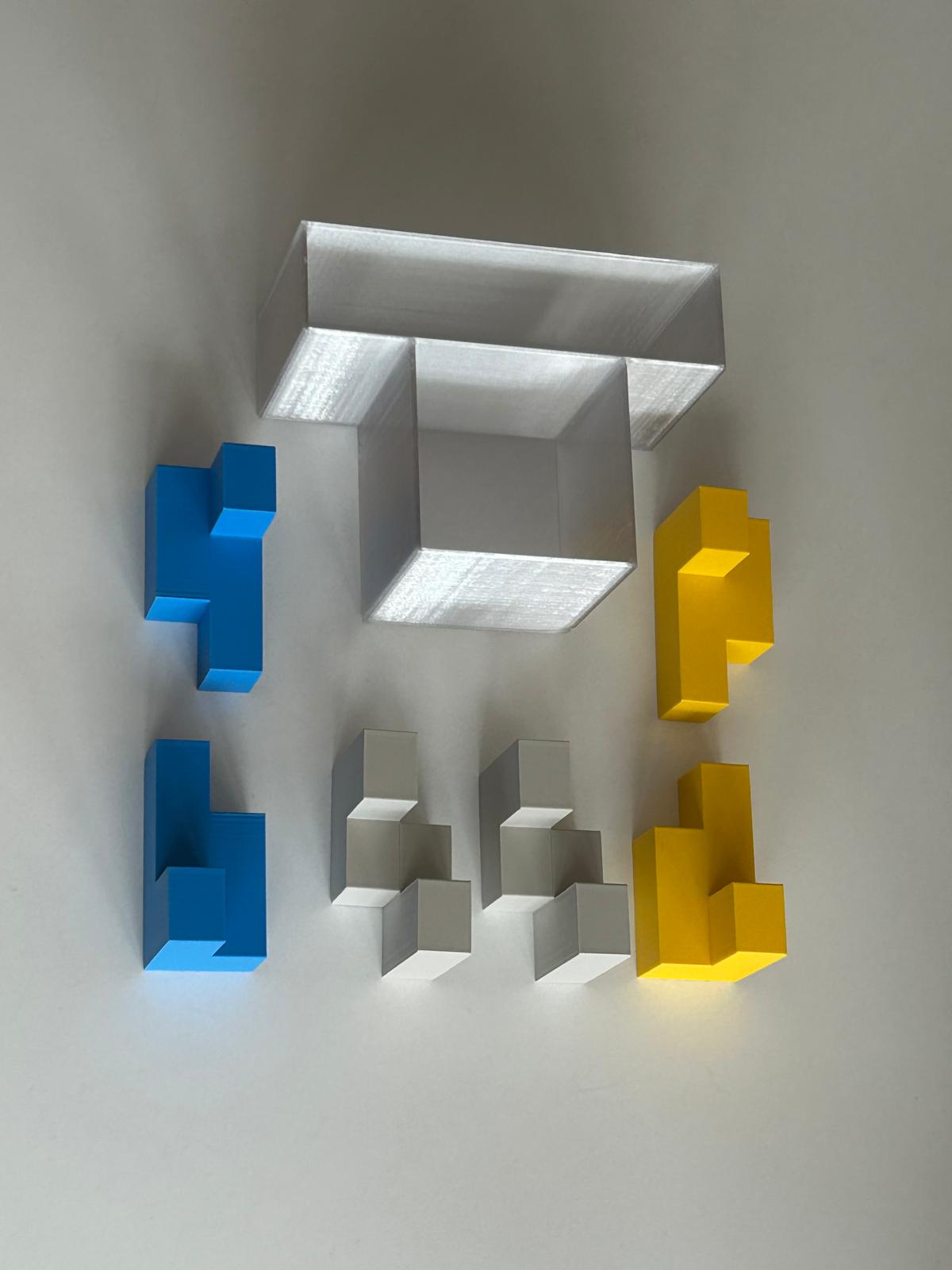 Six puzzle pieces are taken out of the rectangular box and stored in the Cube Box